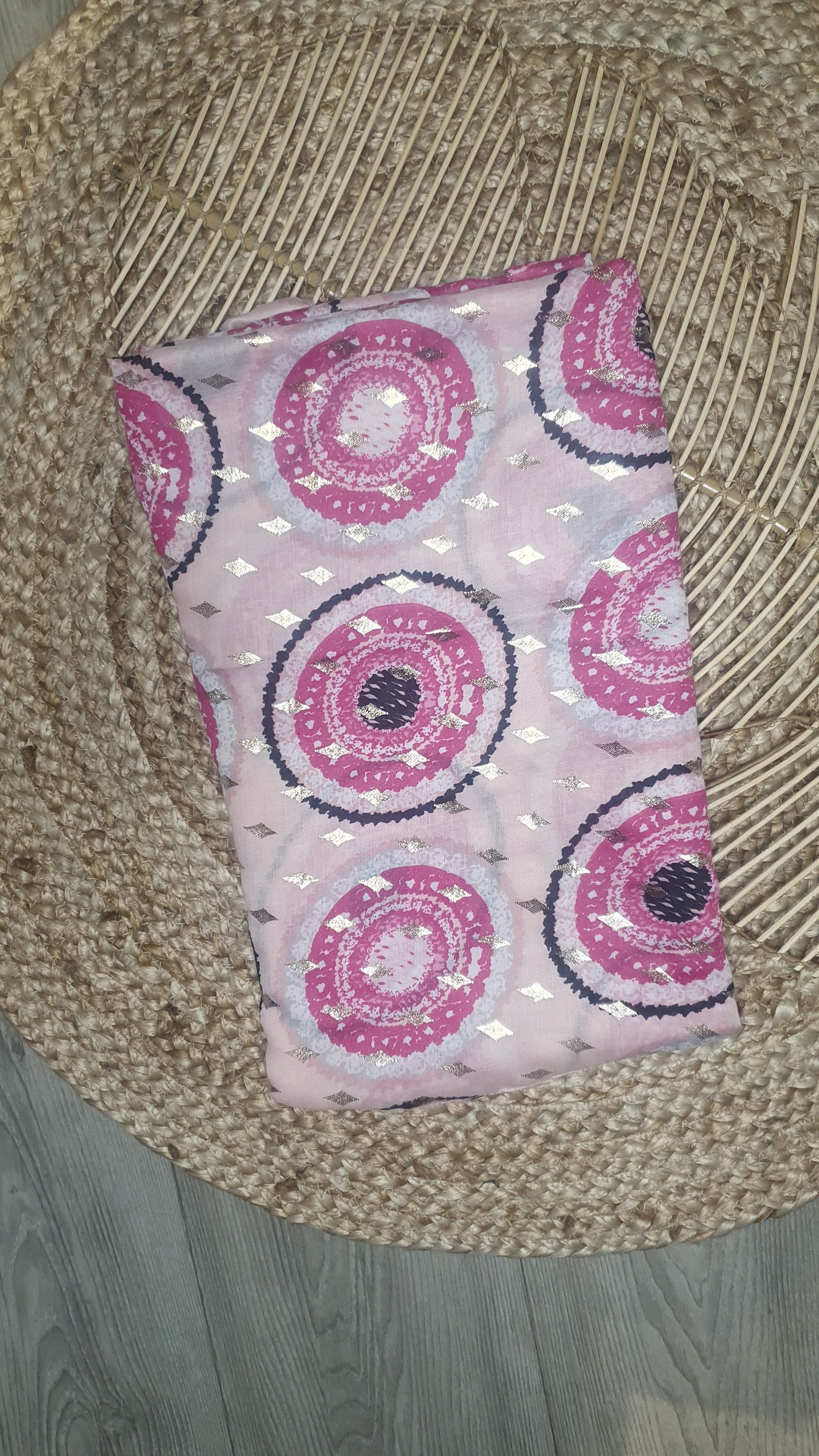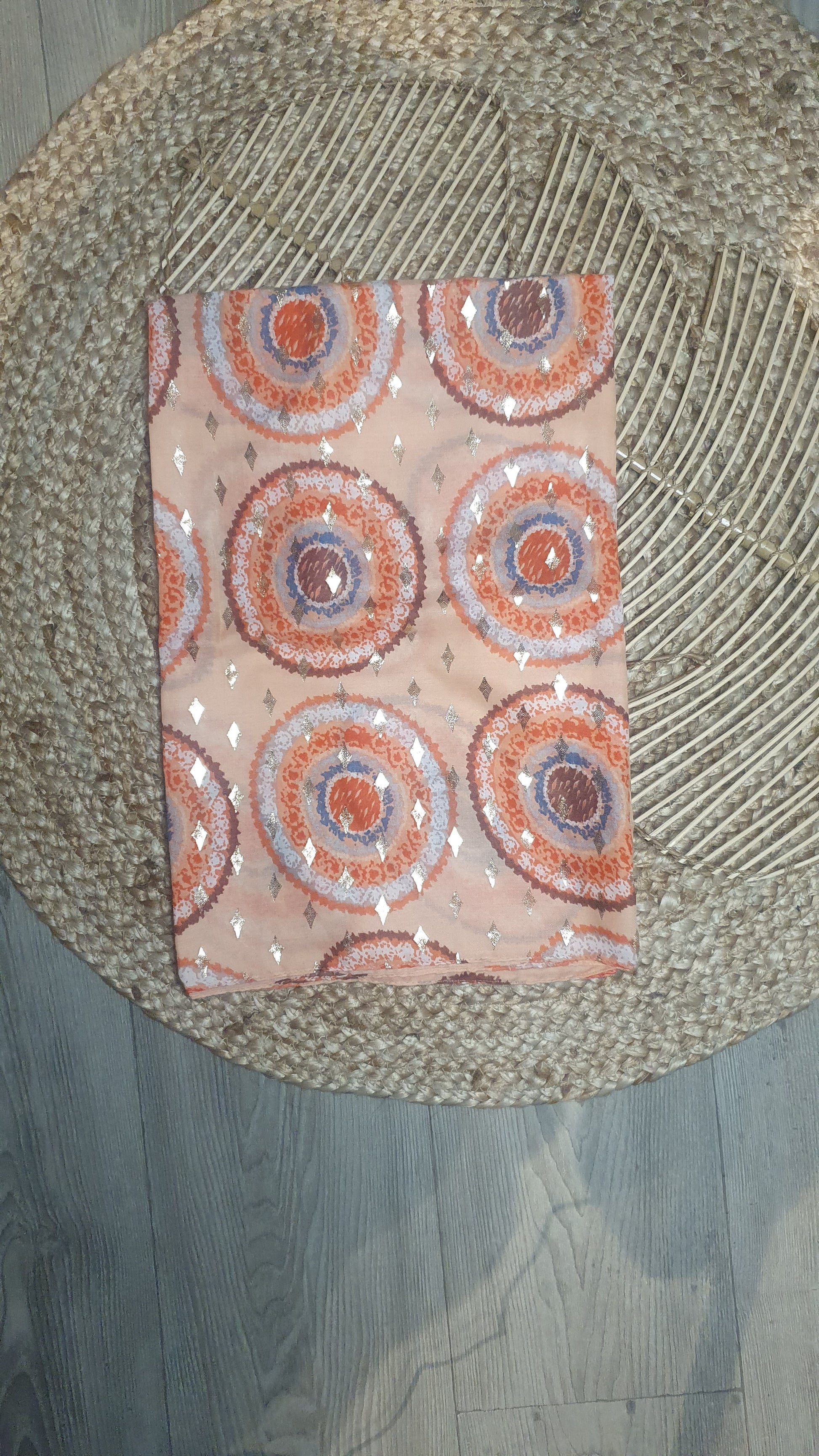 Sjaal van heerlijk zachte stof met cirkelpatroon en gouden details.